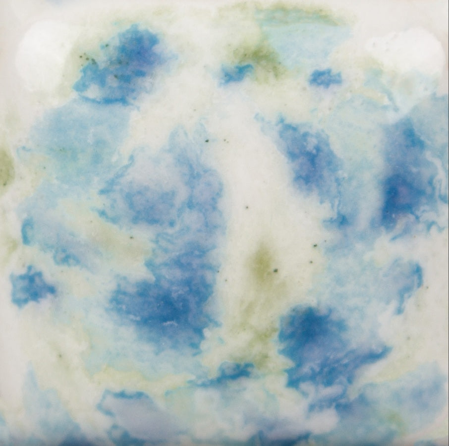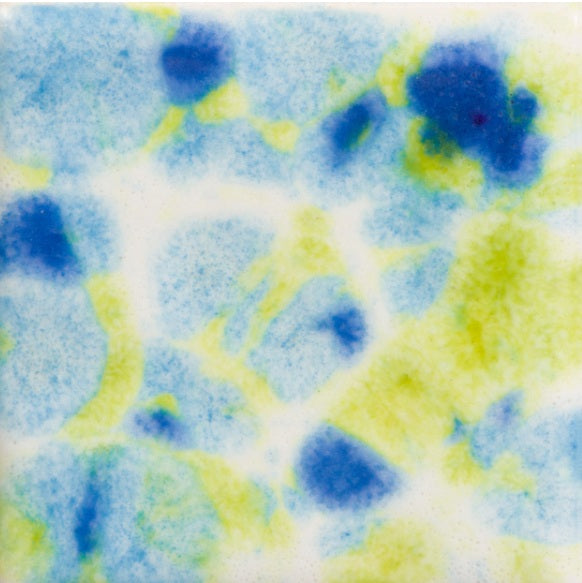 Oxidação do cone 06 (foto grande): Gogh Iris é um esmalte de base branca opaca com uma variedade de cristais azuis e verdes.