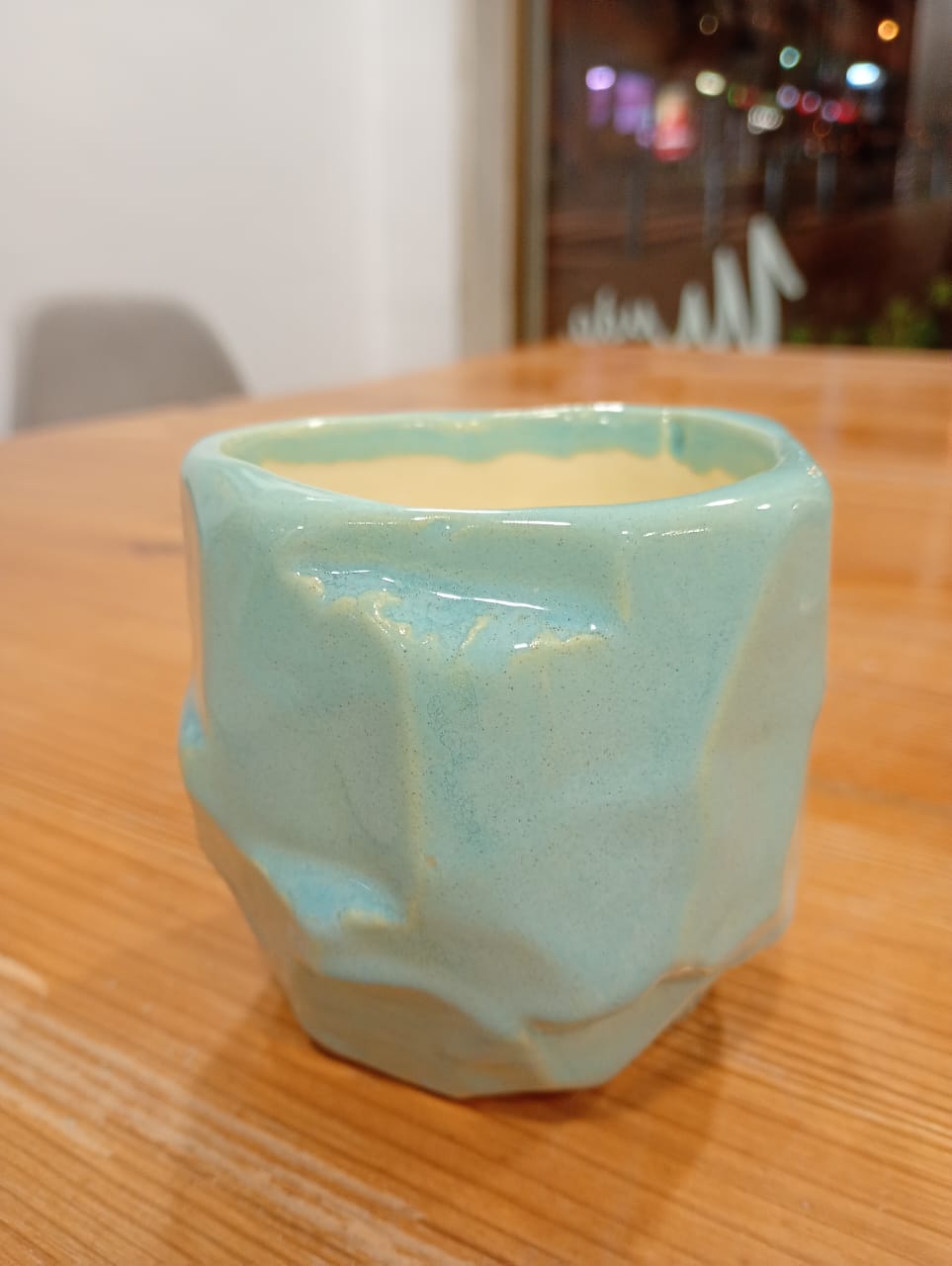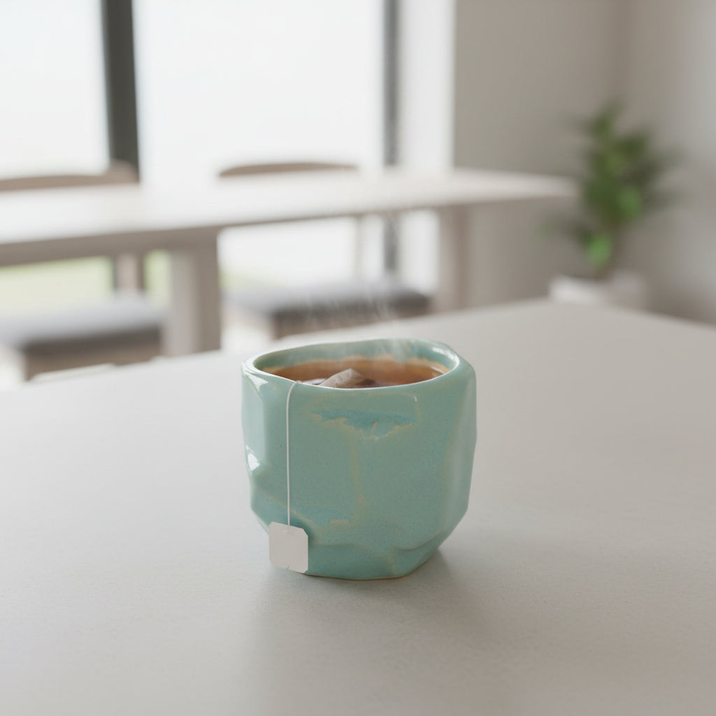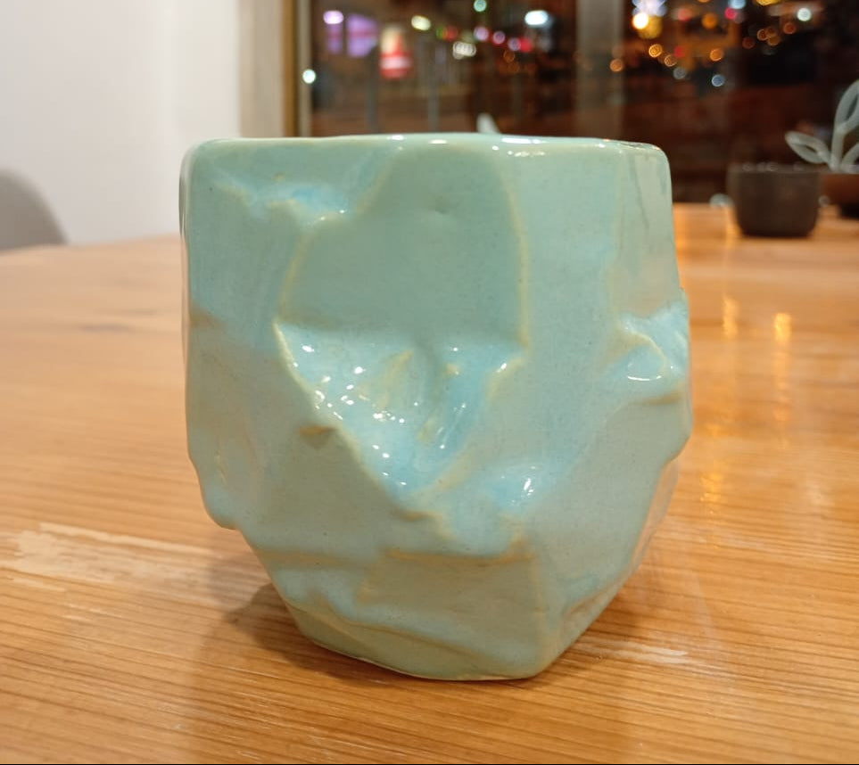 Este copo em cerâmica é elaborado com a tradicional técnica japonesa Kurinuki, que destaca a beleza natural da cerâmica trabalhada à mão. O vidrado exterior em verde água confere-lhe um acabamento elegante e moderno, enquanto o interior com vidrado transparente permite uma utilização prática e fácil limpeza.