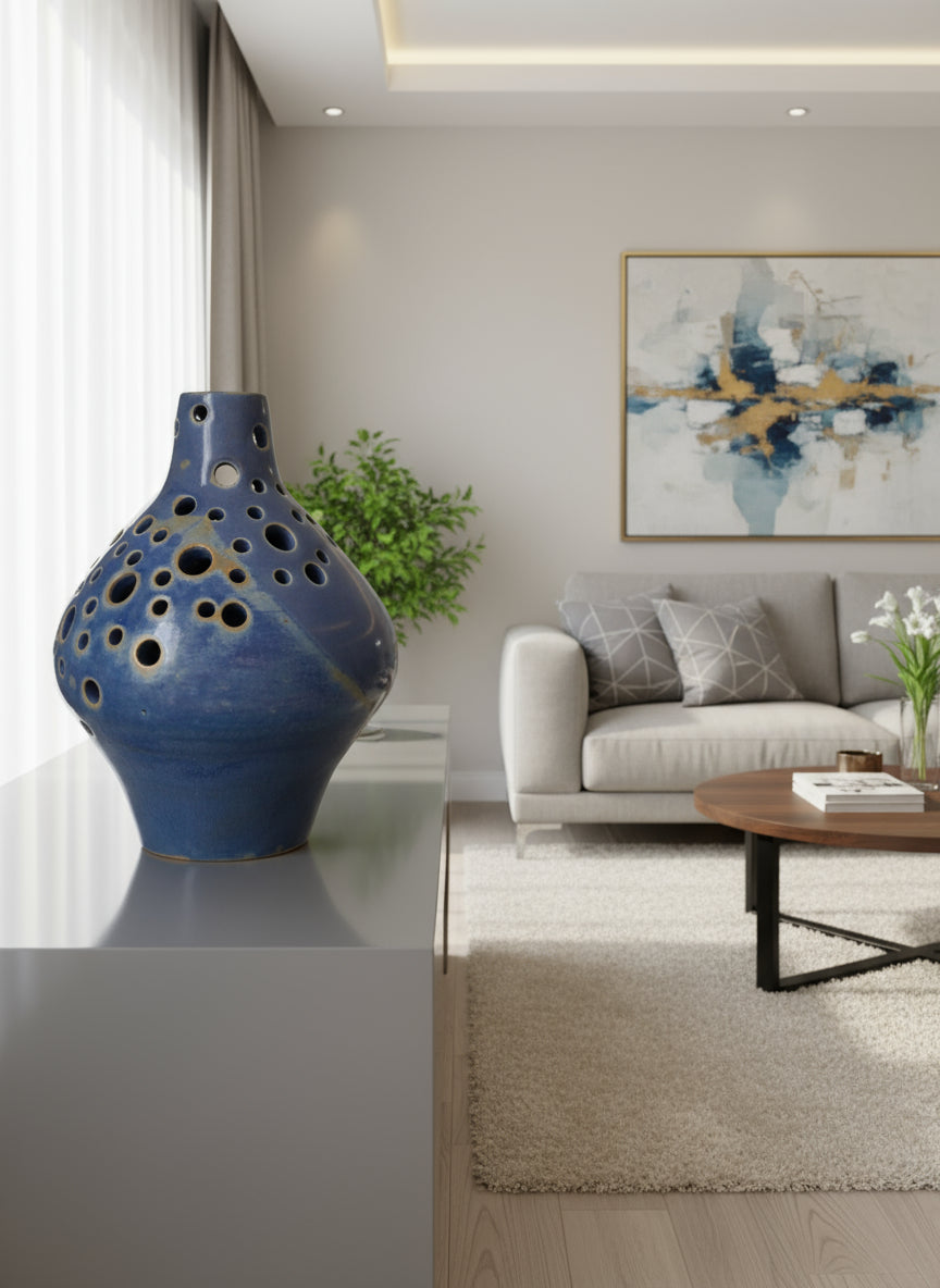 Dê um toque de elegância e tranquilidade à sua casa com esta jarra decorativa em cerâmica vidrada azul.