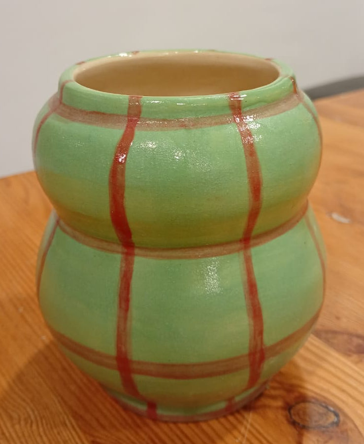 Esta jarra em cerâmica grés é cuidadosamente feita na roda de oleiro, refletindo a autenticidade do trabalho artesanal. É decorada com engobe verde e riscos vermelhos, criando um contraste vibrante e expressivo que torna cada peça única.