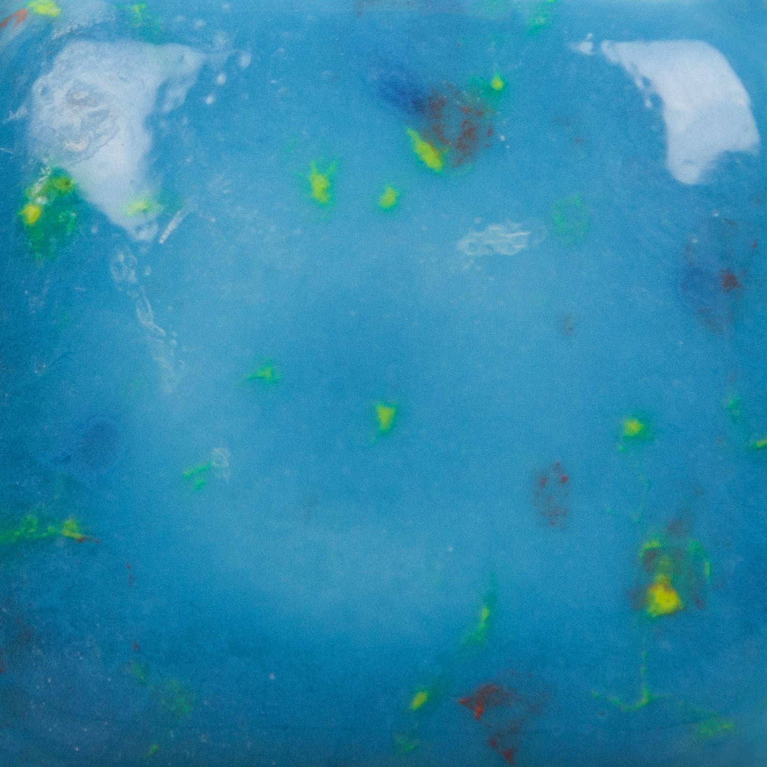 Cone 06 – oxidação (imagem maior): Blueberry Bubblegum é um vidrado base opaco de azul vibrante com cristais laranja, amarelos e azuis.
