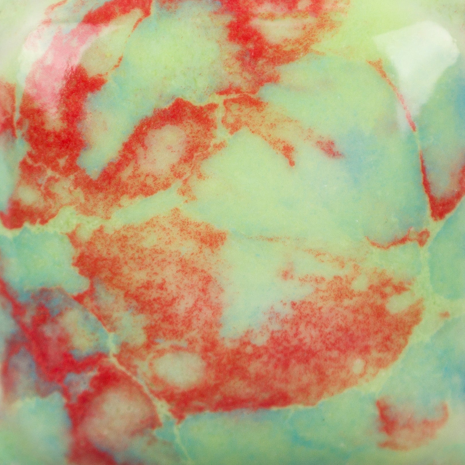 Cone 06 – oxidação (imagem maior): Cherry Limeade é um vidrado base opaco de cor chartreuse, com cristais vermelhos e azul-claro.