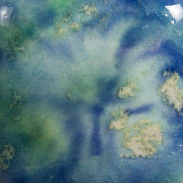 Cone 6 – oxidação (imagem maior): Blue Caprice é um vidrado base opaco de azul vibrante, com cristais verdes, amarelos e azuis.