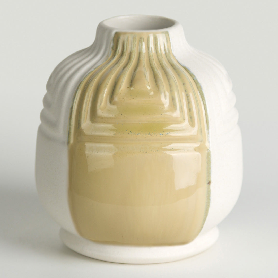 Cone 6 – oxidação (imagem menor): A cor muda para um amarelo brilhante que quebra sobre a textura; pode ocorrer cristalização azul. Mobilidade aumentada. Podem ocorrer problemas na superfície.