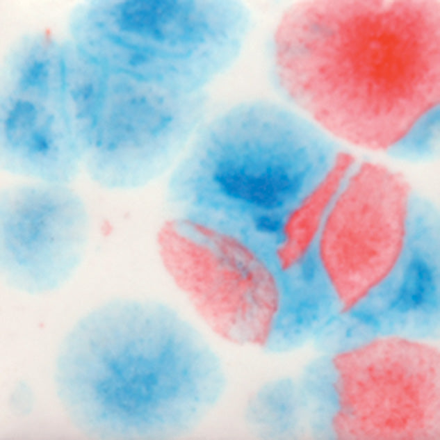 Cone 06 – oxidação (imagem maior): Kaboom é um vidrado base opaco branco com cristais vermelhos e azuis que florescem.