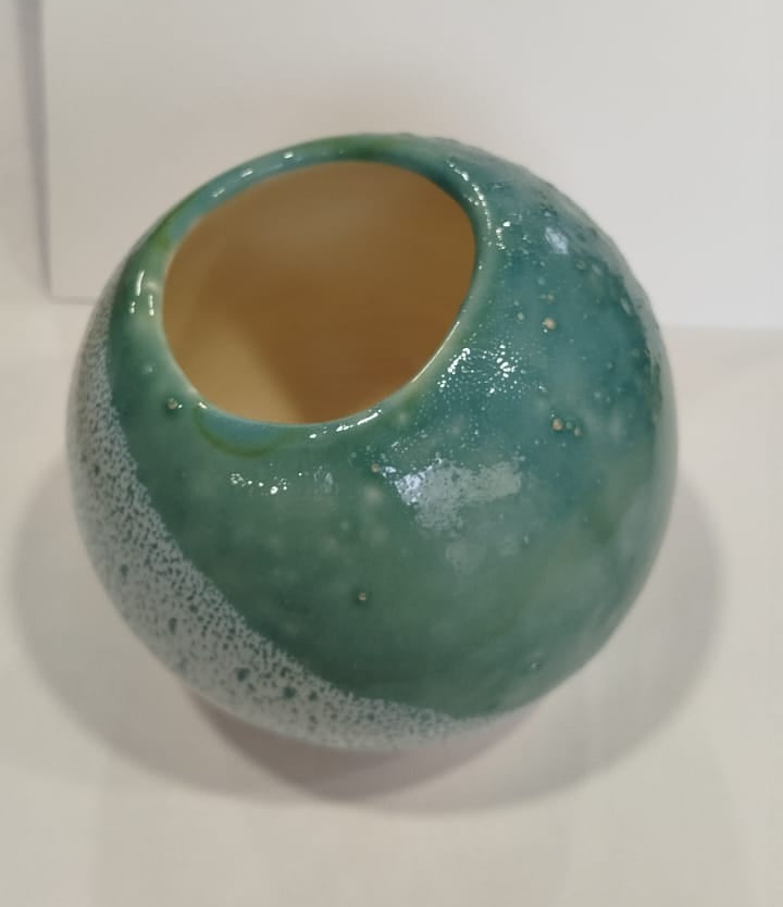 O acabamento em superposição de esmaltes branco e turquesa cria um jogo de cores suave e natural, tornando cada peça verdadeiramente única.