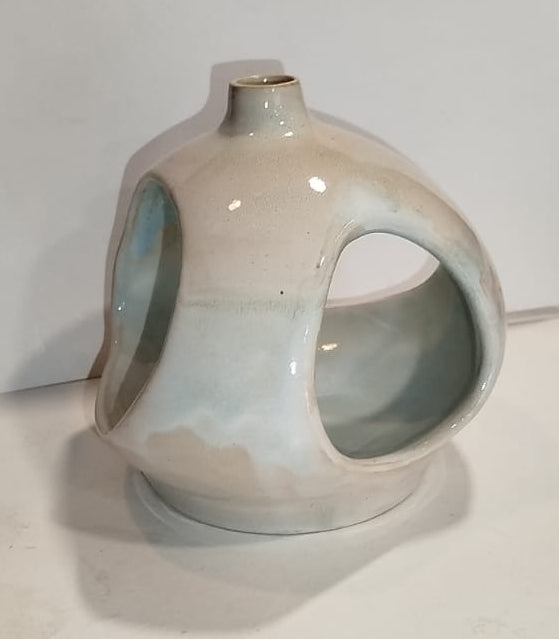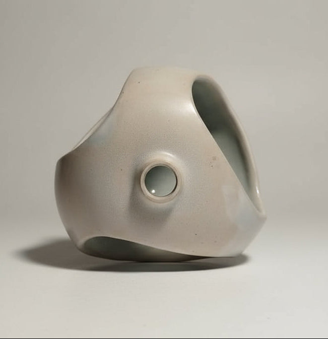 De forma semiesférica e design contemporâneo, esta peça decorativa em cerâmica distingue-se pelas três aberturas laterais, que lhe conferem leveza e um caráter escultórico.