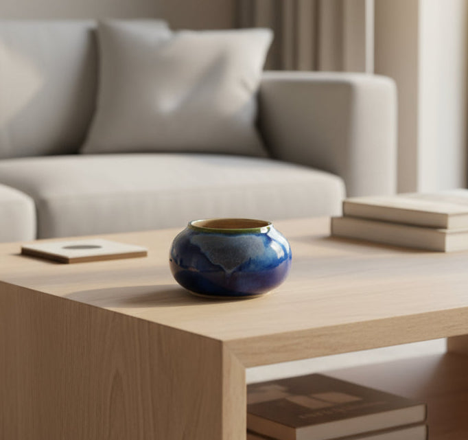 O esmaltado azulino confere profundidade e brilho subtil, tornando cada peça única e cheia de personalidade.
