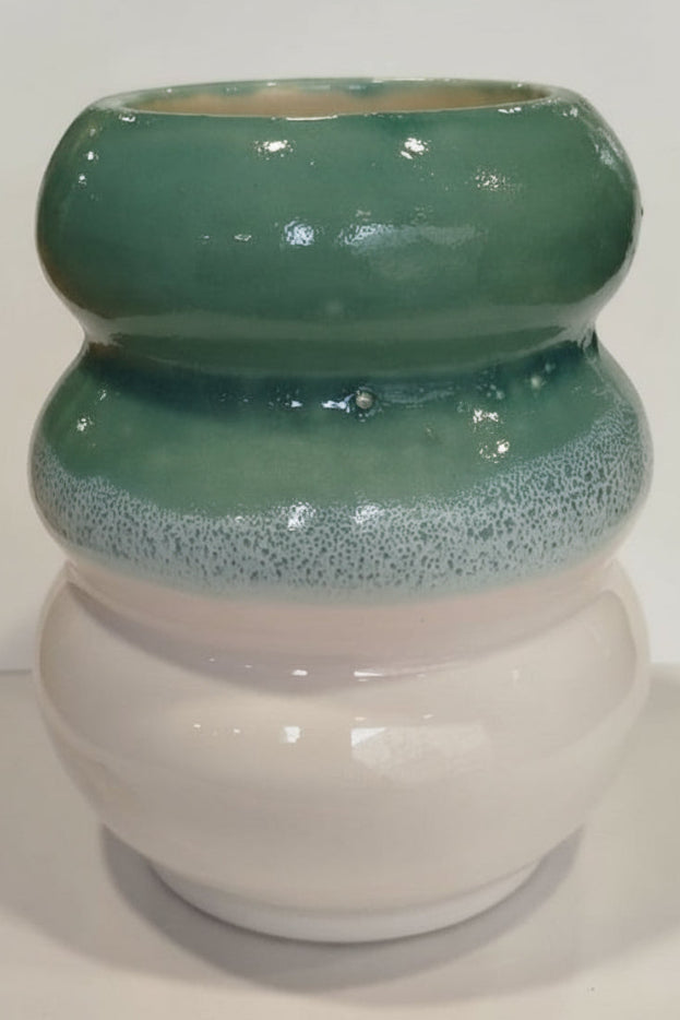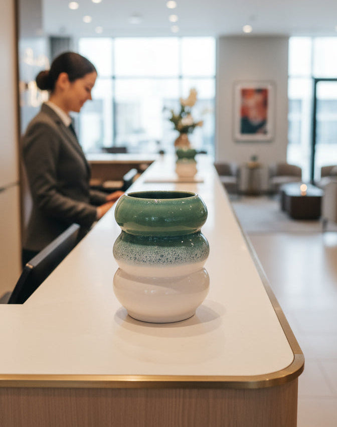 De forma delicada e expressão artística, esta peça decorativa em cerâmica destaca-se pela fusão harmoniosa entre os tons turquesa e branco, criando um efeito de sobreposição de esmaltes que confere profundidade e movimento à superfície.