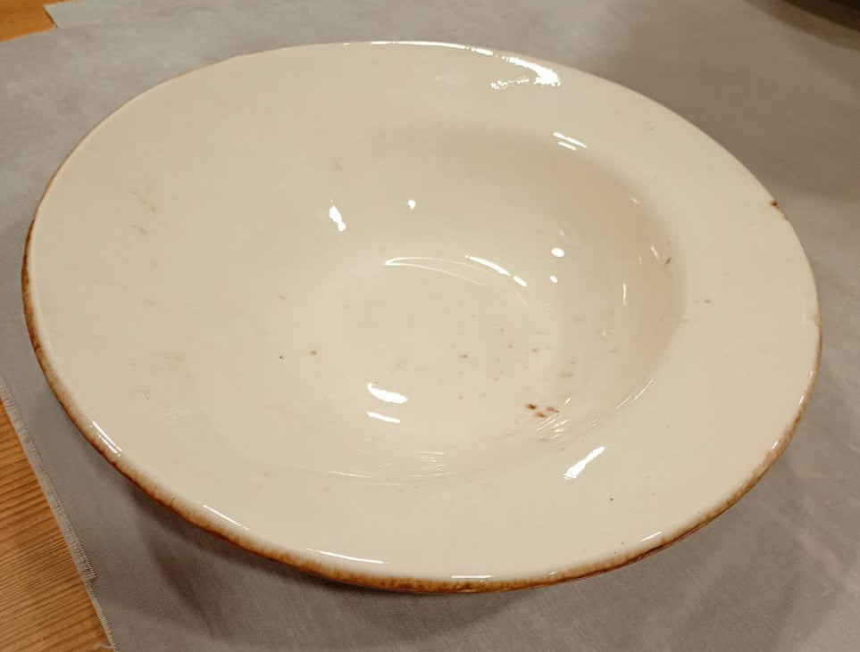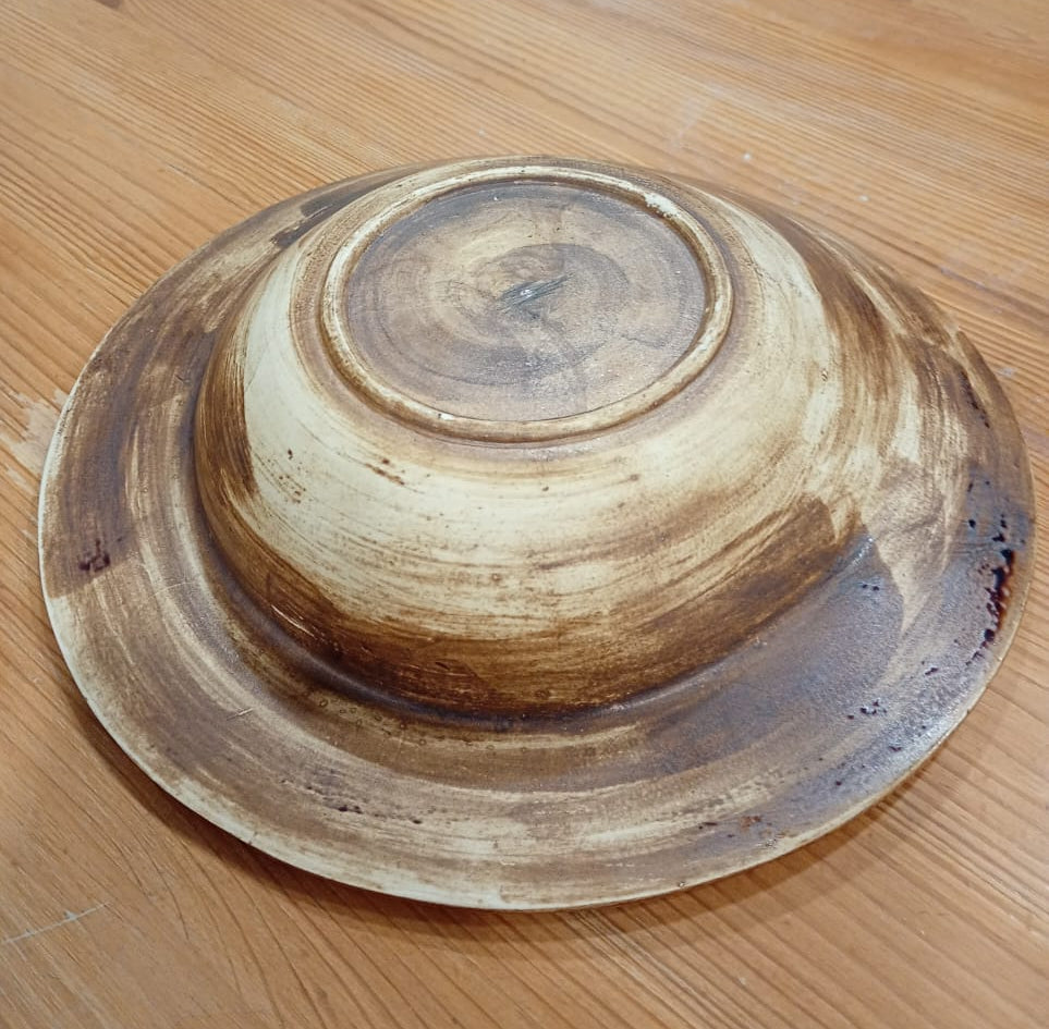 Este prato fundo é feito em cerâmica grés, com uma forma irregular e asas discretas, que lhe conferem carácter artesanal e originalidade. O esmaltado transparente protege a peça, enquanto as pequenas pintas castanhas no interior adicionam um detalhe subtil e elegante.