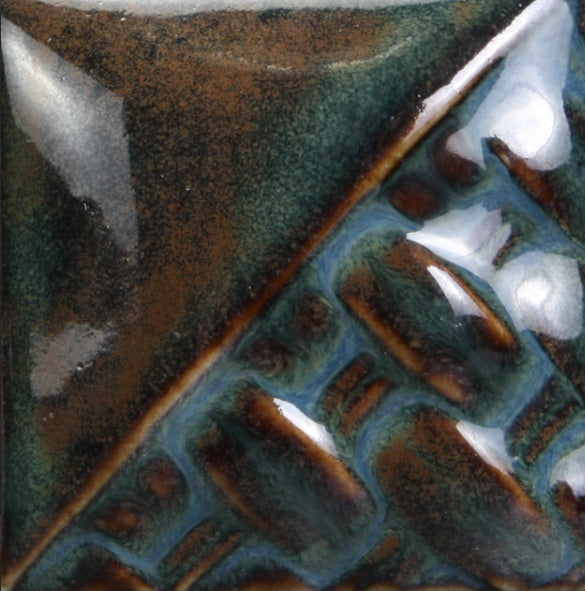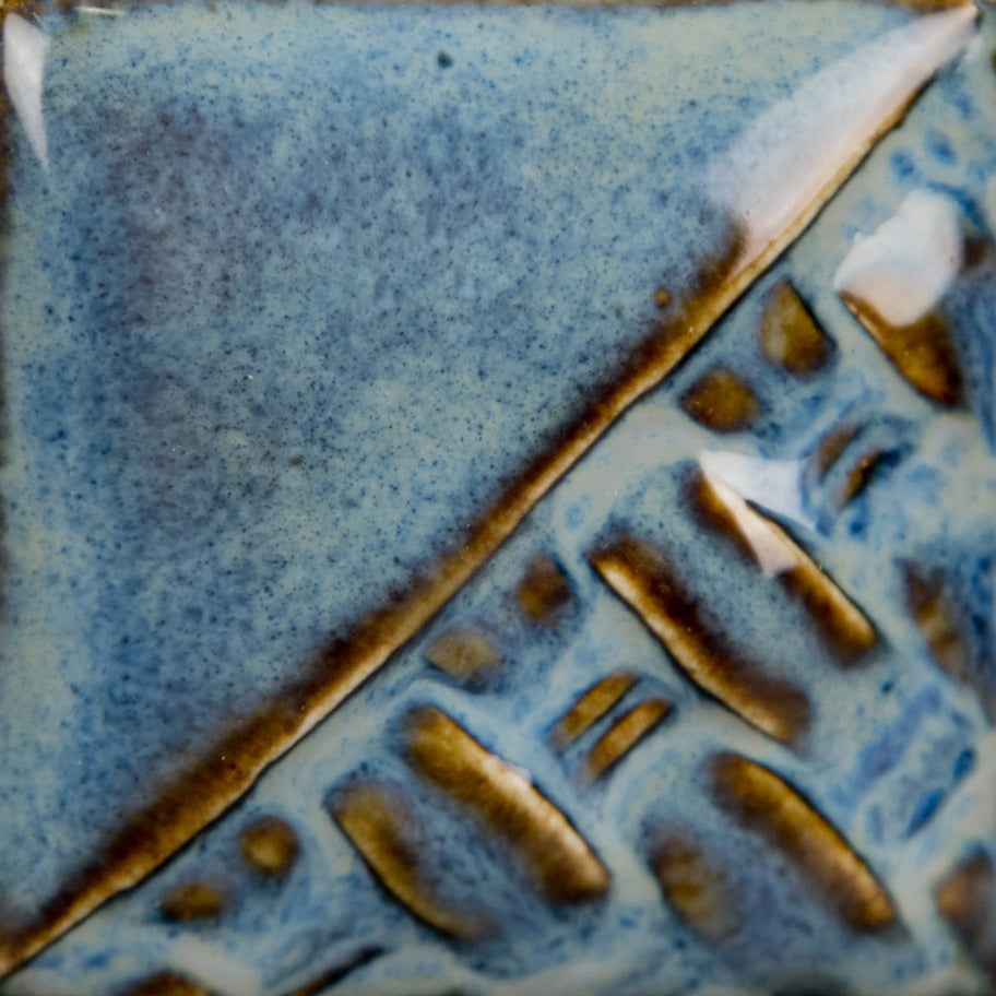 Oxidação do cone 6 (imagem maior) : Stoned Denim é um esmalte azul variegado que quebra o marrom.