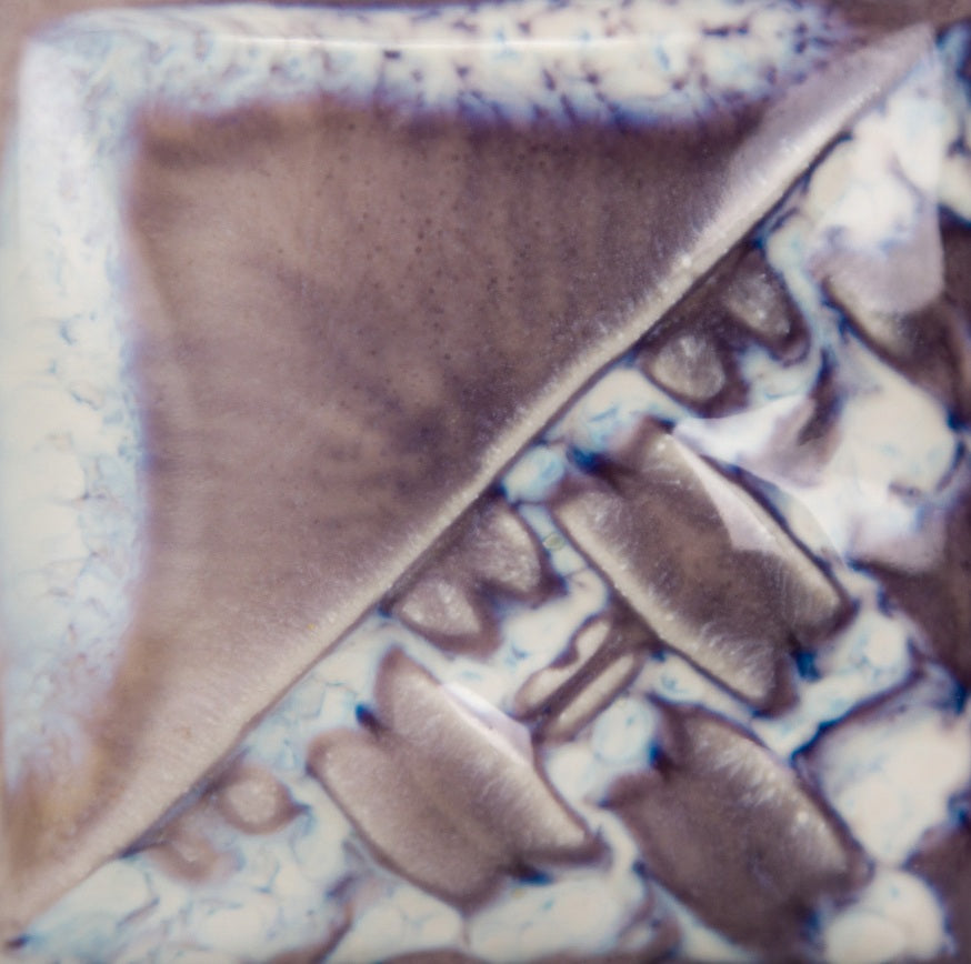 Oxidação do Cone 6 (imagem maior) : Micro Pearl é um esmalte branco brilhante, semi-opaco, com nuances lilás que se desfazem na textura. Microcristalização iridescente em tons de lilás e amarelo-claro se desenvolverá durante o processo de queima.