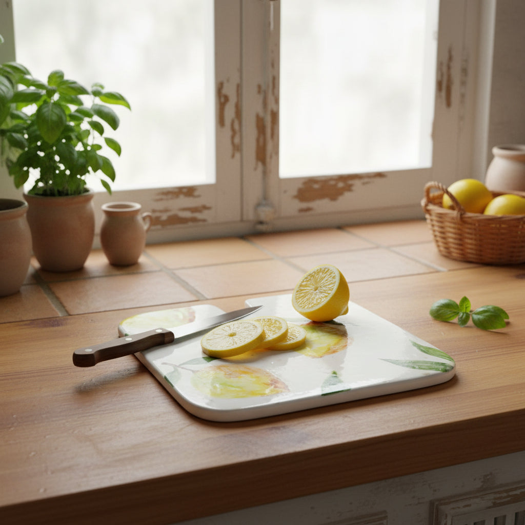 Estas tábuas de cozinha em cerâmica são produzidas com a tradicional técnica de majólica, caracterizada por cores vivas e um acabamento vidrado distinto. Cada peça apresenta desenhos feitos à mão, tornando cada tábua única e com um forte carácter artesanal.